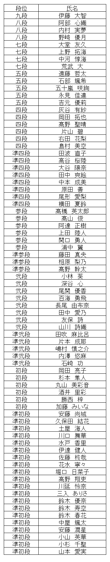 段位、1級、2級、3級のみの速報です。 10段は本部審査のため遅れることがあります。