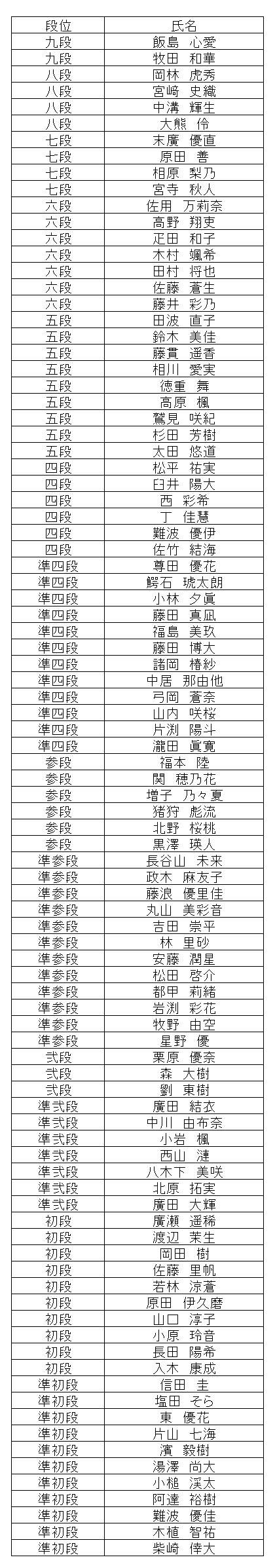 段位、1級、2級、3級のみの速報です。 10段は本部審査のため遅れることがあります。