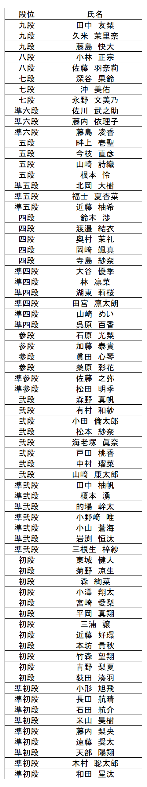 段位、1級、2級、3級のみの速報です。 10段は本部審査のため遅れることがあります。
